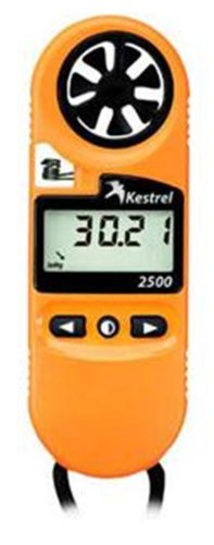 2500 Pocket Weather Meter - Orange. Part #: 0825. The Kestrel 2500 Pocket Weather Meter measures wind and temperature with total accuracy, and has the added benefits of an air pressure sensor that provides altitude and barometric information. Kestrel 2500 technology enables you to follow changes in air pressure that help predict impending changes in the weather. Factor in the 2500's digital altimeter, and you have most of the weather information you need for outdoor activities ranging from model airplane flight to rifle practice. The Kestrel 2500's sensitive and user-replaceable impeller technology provides accurate wind speed info. Additionally, an external temperature sensor and waterproof casing allow you to gauge the temperature of water (it even floats) and snow, as well as the open air. A hard slide-on case, lanyard, and battery are included. Kestrel Pocket Weather Meters like the Kestrel 2500 are an essential tool for target rifle shooters and military professionals, and prove invaluable to outdoor enthusiasts (like skiers and mountain climbers) who need accurate and up to the minute weather information. The Kestrel 2500 accurately measures: Current Wind Speed, Maximum Wind Gust & Average Wind Speed. Air, Water & Snow Temperature. Wind Chill. Barometric Pressure. Altitude. Real-time clock. Protective cover with sure-grip overmolding. Data hold function. Large easy-to-read display with backlight. Waterproof and floats. Innovative design for stability and accuracy in abrupt condition changes. Patented user-replaceable impeller. Quick response, external thermistor. High precision pressure sensor. Reliable, portable and easy to use. All instruments and accessories are completely assembled in the USA.